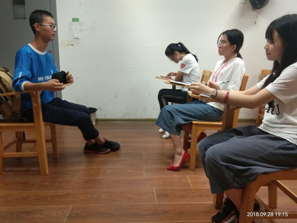 面试开始后,引导员陆续分批将已签到的同学引领至各个面试教室,不同教室中已安排好外联部的干事作为面试官开展面试。进行面试的同学无不先礼貌地对面试官进行问好,然后端正坐下,开始自我介绍。各位同学精心准备的自我介绍中各有风采:老道的工作经验使人赞叹,丰富的活动经历令人信服,动情的生活诉说让人感动。无论是有条不紊、沉着冷静还是热情诉说、发自肺腑,都体现了同学们对与时代脱节又不愿被社会边缘化的老人真切的关怀,与成为志愿者与老人亲近交流、将温暖传递给老人的决心。