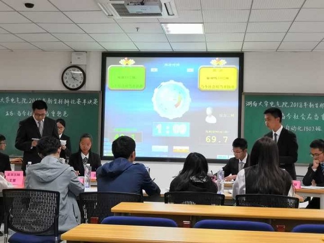 在电自1807班和自动化1802班双方简洁的自我介绍后,比赛正式开始。双方就“当今社会应当重惩恶还是应当重扬善”这一论题展开了精彩激烈的辩论。正方认为惩恶能够监察打击恶性事件,有利于维护社会的公正稳定,可以抚慰受害者受伤的心灵。反方则认为惩恶太过于局限,相反扬善可以营造一种善意的社会氛围,从而潜移默化的影响人们的行为,使小矛盾得以更完美的解决。紧接着的盘问环节中,双方辩手分别都抓住对方立论中的漏洞进行反驳,并不断强化自身观点,比赛渐入佳境,赛场气氛也愈加热烈。而接下来的盘问小结中,双方再次重申自身观点。辩手们旁征博引,你来我往,下面的自由辩论环节更是让这次比赛进入白热化阶段。