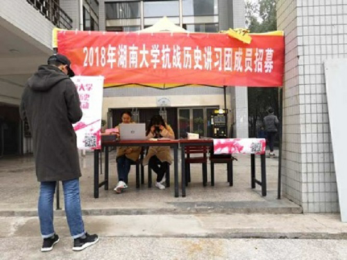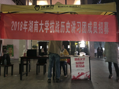 外联实践部在德智宿舍园区开展了2018年湖南大学抗战历史讲习团成员招募的线下报名活动。