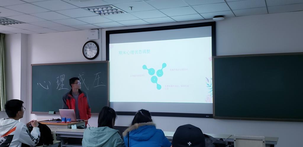 在第二部分,李彬贤同学向同学们介绍了许多简单实用的减压小方法、小技巧,帮助同学们正确积极地进行自我评价,努力克服不良的心理活动,鼓励同学们多参加课外活动,保持乐观心态,为第一次期末考试做好准备。