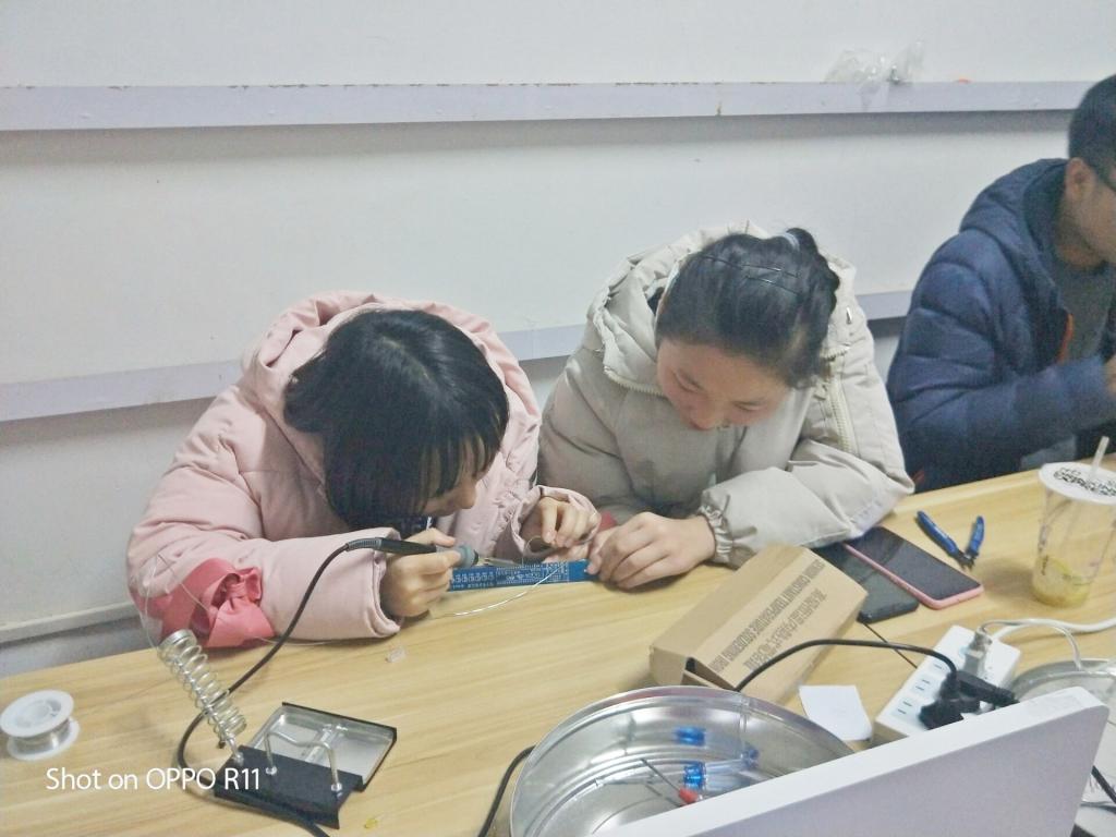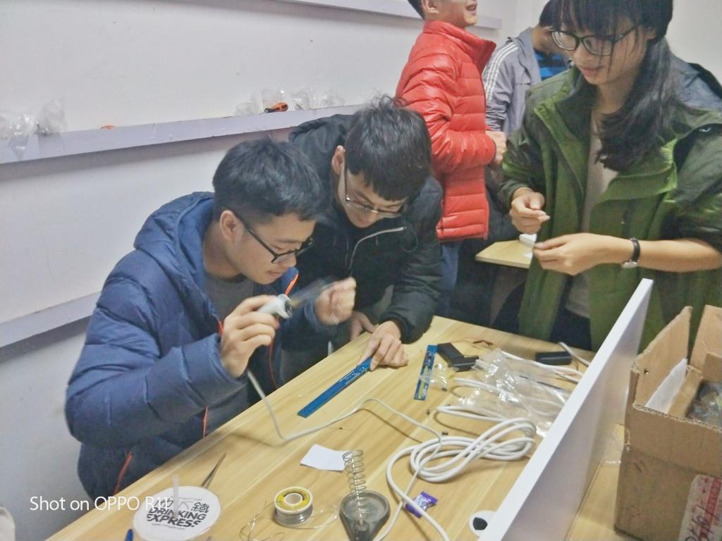 当日下午,同学们在爱迪生工作室集合,开始了这次竞赛活动。考虑到班级里只有部分人学习过焊接电路板,本次活动采用分组的方式,三人一组,每组至少有一人能够自主焊接电路板,其他人先学后焊,确保每个人都有上手的机会。