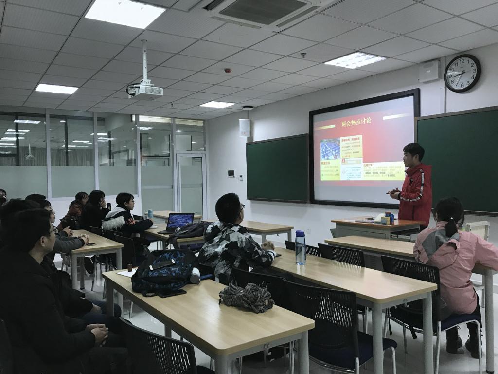 观影过后,在主持人吴庆伟的带领下,党支部的同志们开始讨论两会。今年的两会中出现了非常多的热词,同时这些内容又十分紧密地联系我们的生活实际,比如说“全面脱贫”、“西湖大学”和“携号转网”等等。